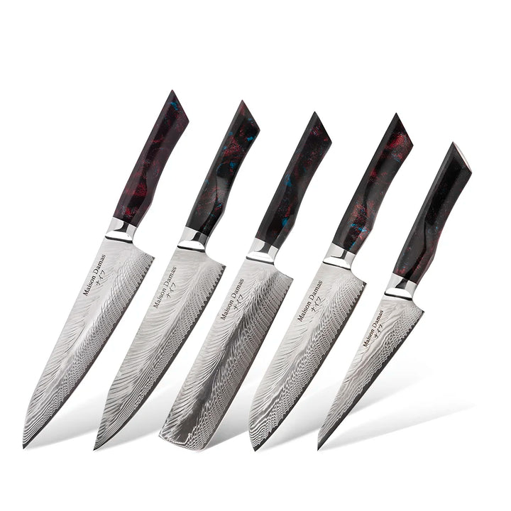 Together, these five knives form a complete set, designed to offer balance, performance, and longevity to all cooking enthusiasts.