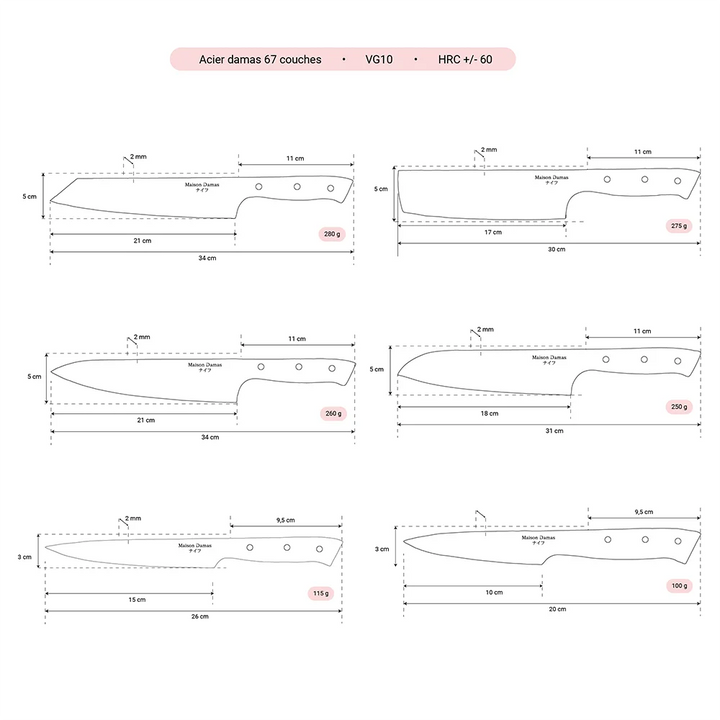 - Lames : acier damas 67 couches, angle d'aiguisage de 15° sur chaque face
